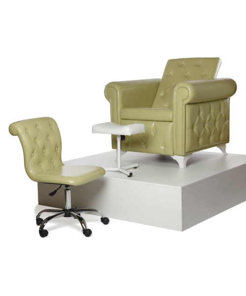 Удобный стул мастера с изогнутой спинкой и декоративными пуговицами, которые украшают внутреннюю часть спинки.